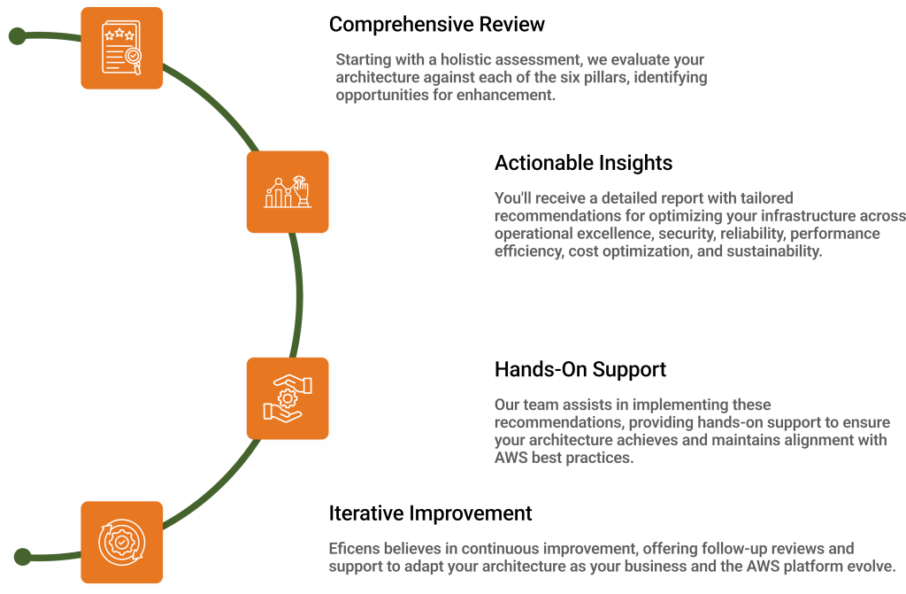 Eficens harnesses the AWS Well-Architected Framework to assist cloud architects in constructing secure, high-performing, resilient, efficient, and sustainable infrastructures for diverse applications and workloads. Centered around six critical pillars—operational excellence, security, reliability, performance efficiency, cost optimization, and sustainability—our service provides a thorough approach for customers and partners to assess architectures and implement designs that are both scalable and aligned with best practices.